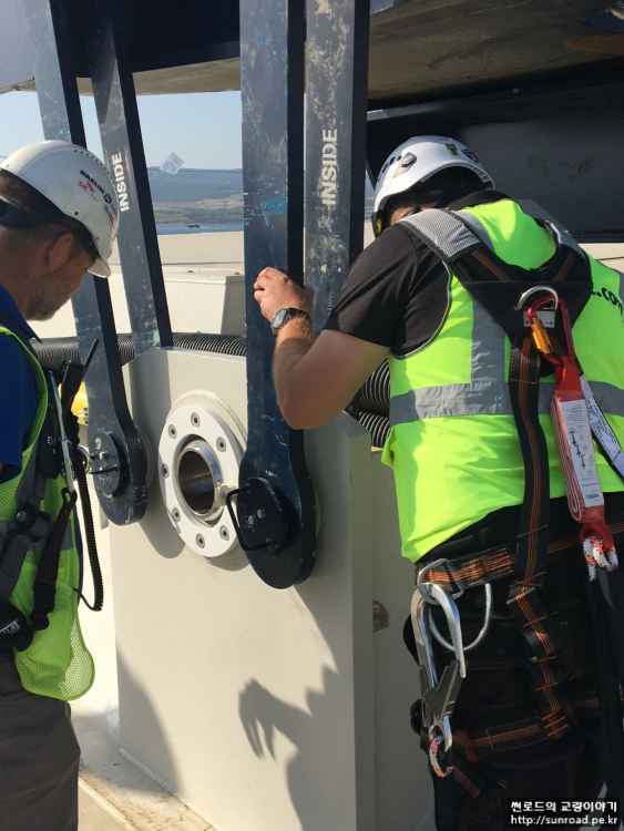 소정의 위치로 데크 인양이 완료되면 데크와 행어 소켓을 핀으로 연결합니다. 행어 Pin의 직경은 160mm 이며 유압잭을 이용하여 삽입후 양단에 Lock Plate을 설치합니다..