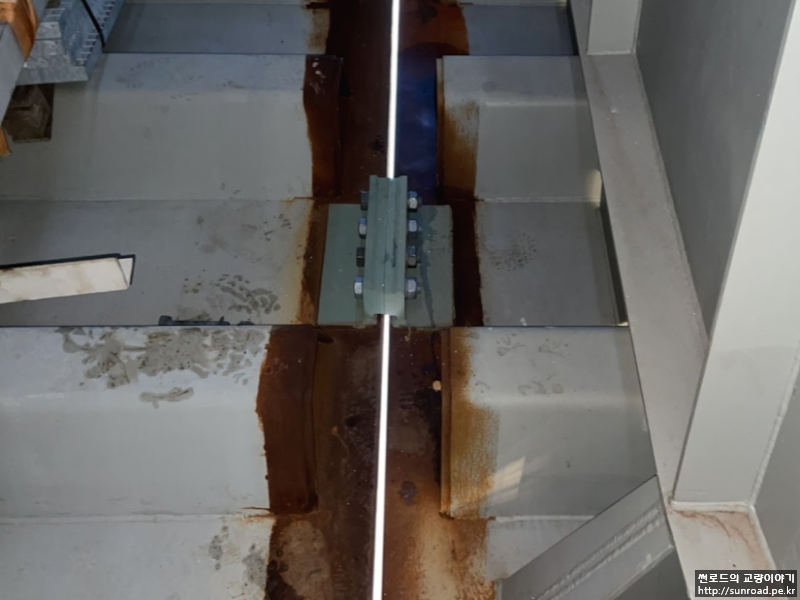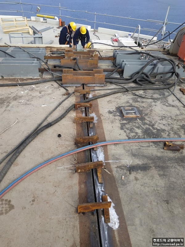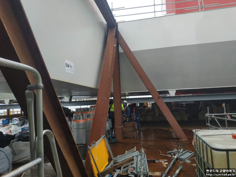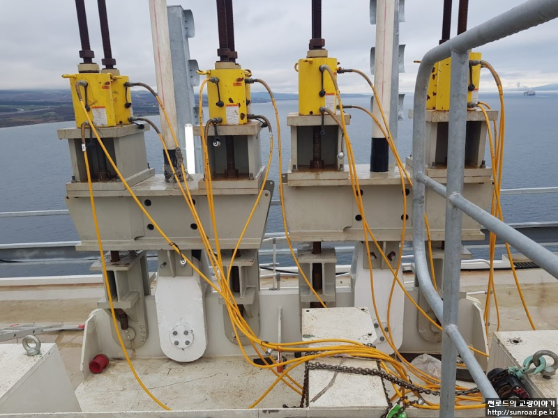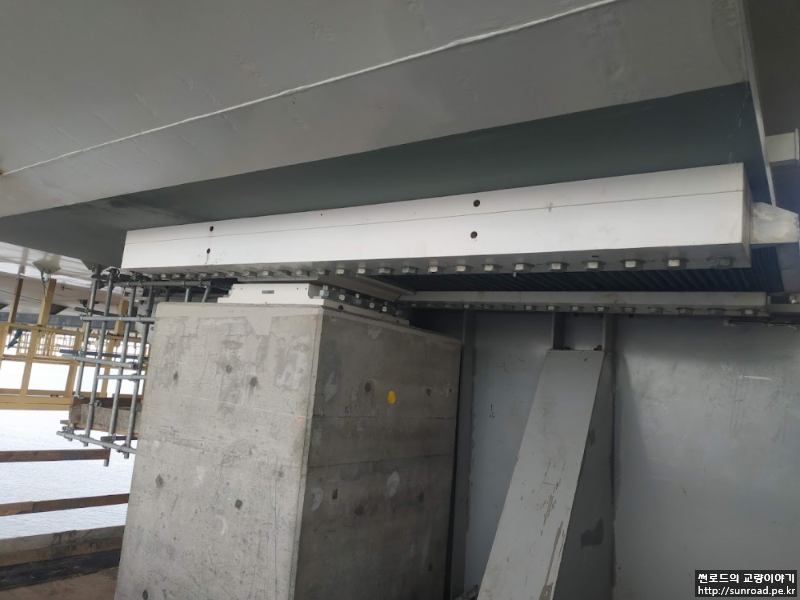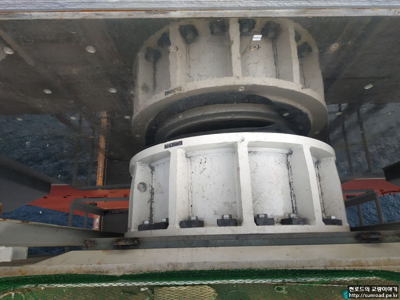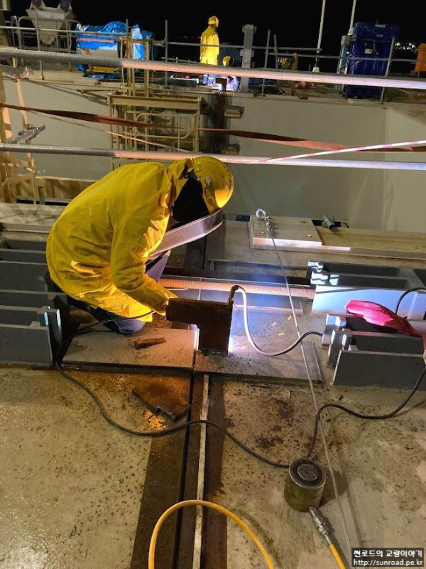 Deck와의 연결이 완료되면 목재 쐐기설치하여 데크의 수평방향 변위를 억제하며,Storng Back을 설치하고 Deck 용접을 실시합니다. 또한 Wind Bearing을 설치하여 줍니다. Wind Bearing의 용량은 2,600 ton으로 먼저 Temporary Shim Plate를 설치하고 Deck 용접 완료 후 실측된 데크와 주탑의 간격을 기준으로 Permanent Shim Plate를 제작, 설치하여 마무리 됩니다.