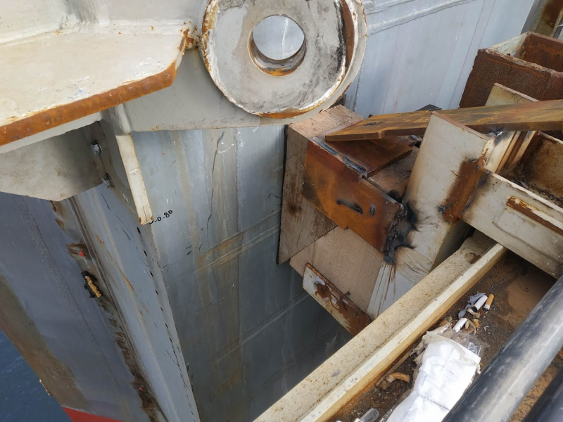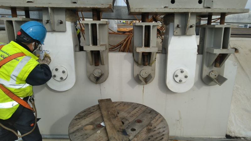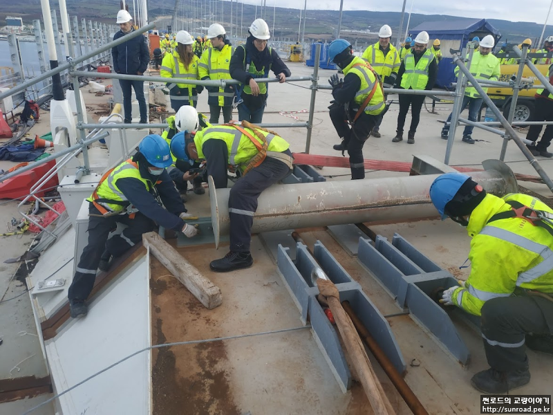 Key Segment가 Deck Level -4m 까지 인양되면 Segment 위치 조정을 위한 슬링벨트와 체인블럭을 주탑에 연결하여 줍니다.