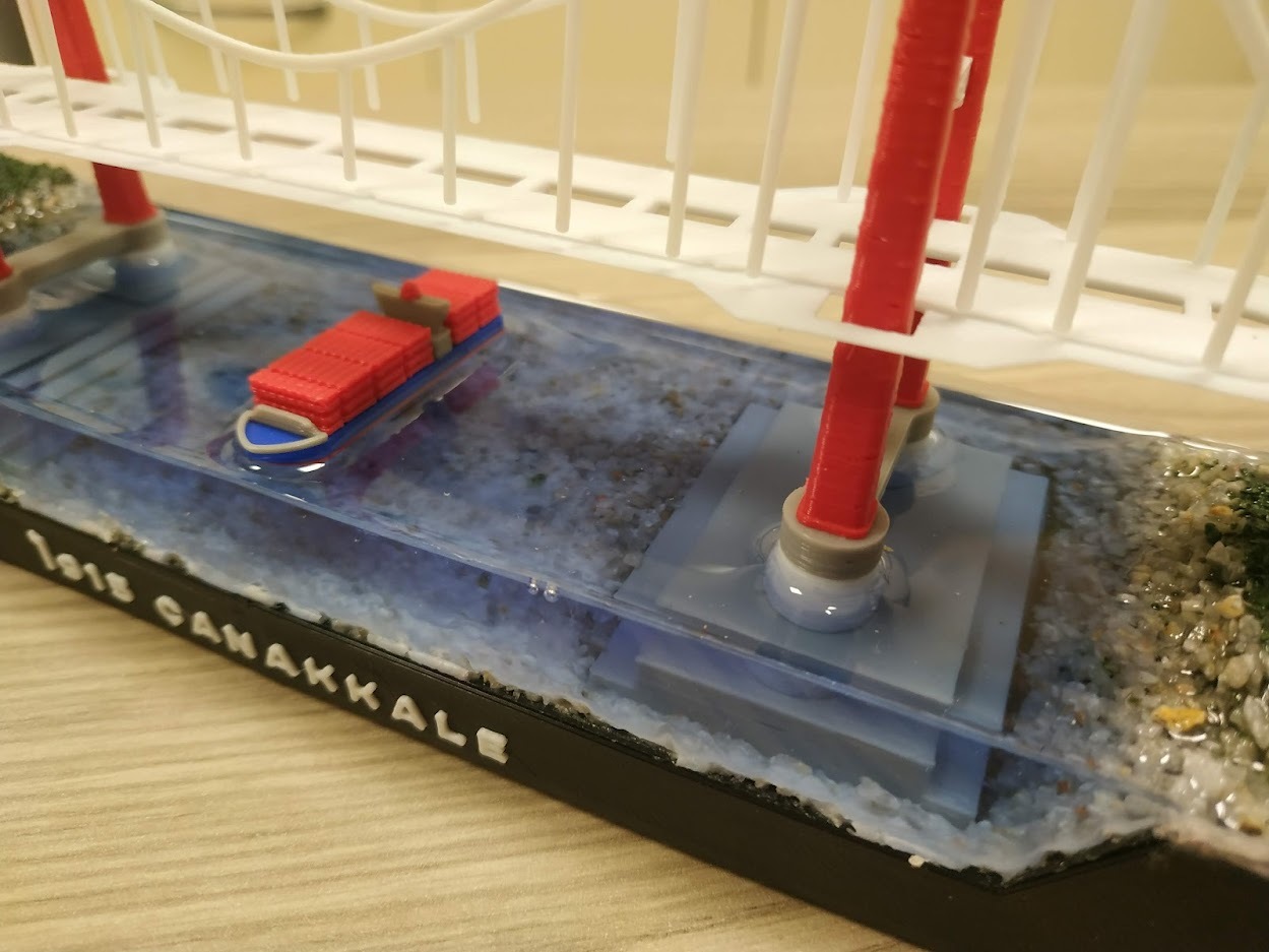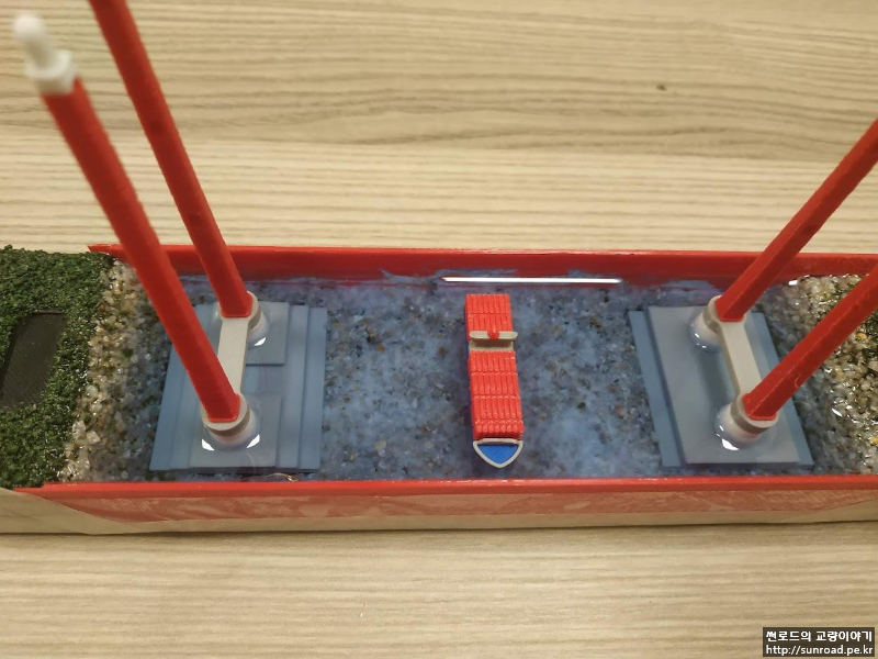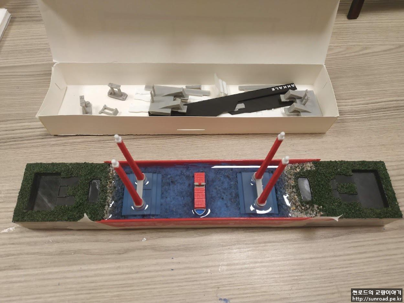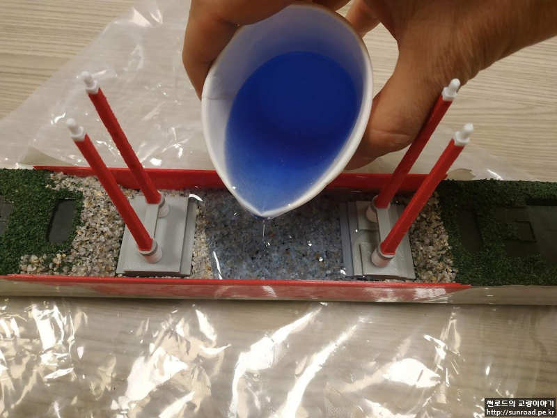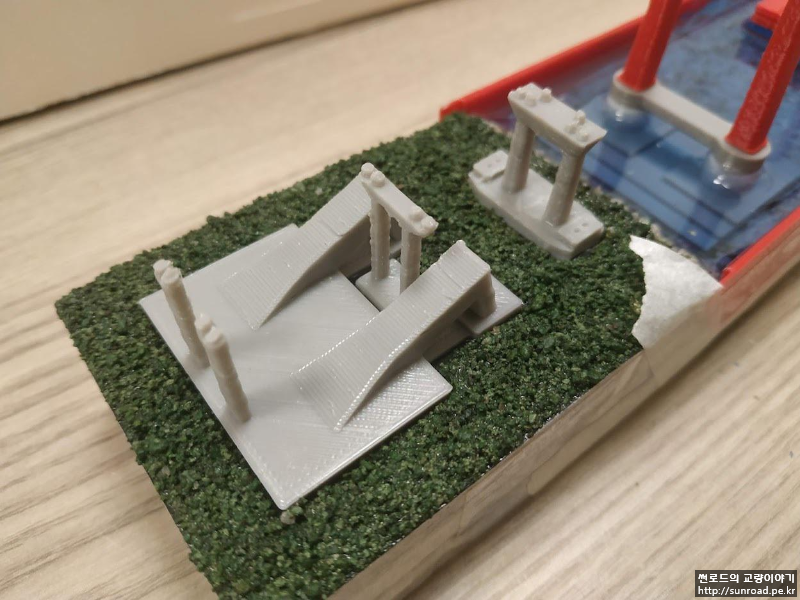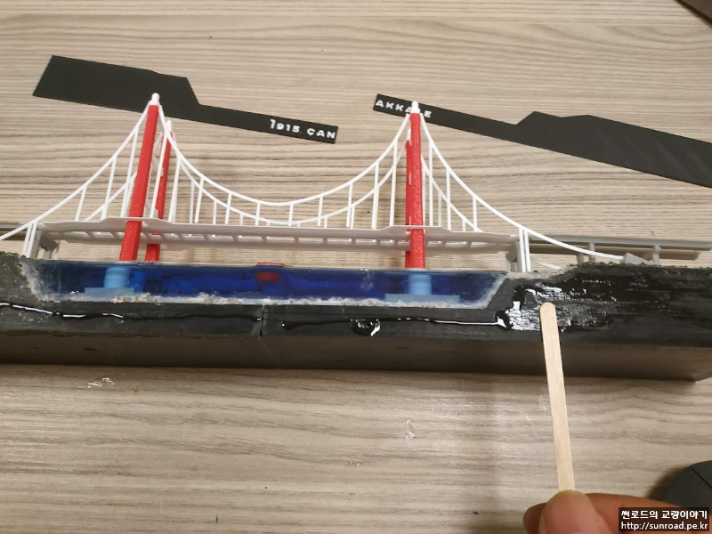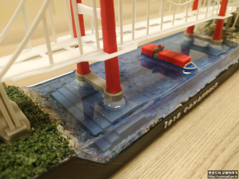 지형을 완성한 후 주탑을 설치하고 레진을 부어 바다를 표현하였습니다. 앞, 뒤 부분을 막기 위해 별도의 벽을 3D 프린터로 출력하여 붙여주었습니다. 3D 프린터로 만든 벽이 충분히 매끄럽지 않아 벽체 안쪽면에는 필름을 붙여주었습니다.