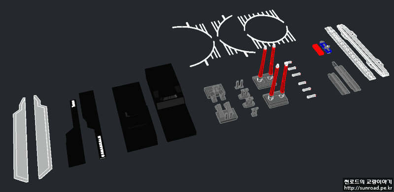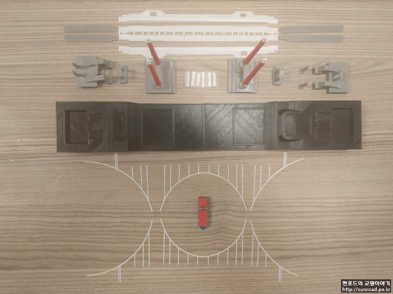 이전 포스트에서도 언급했지만 교량이 워낙 규모가 크다 보니, 파츠를 출력할 때 최소 크기를 고려해보니 전체 교량모형의 길이가 1m는 넘어야 하겠기에 결국 폭/길이/높이 방향 축적을 임의로 조절하여 모형을 만들어 보기로 하였습니다. 먼저 전체 교량모형을 만들고 파츠별로 이리저리 축적을 조정해 Draft 모형을 출력해 보았습니다.