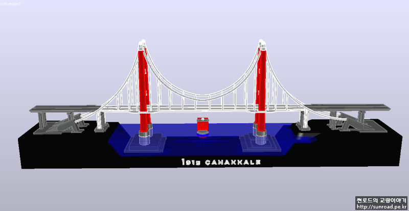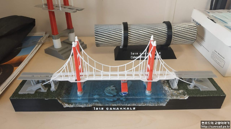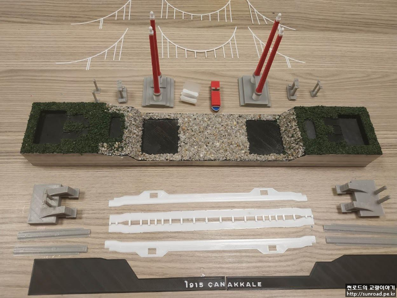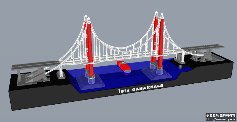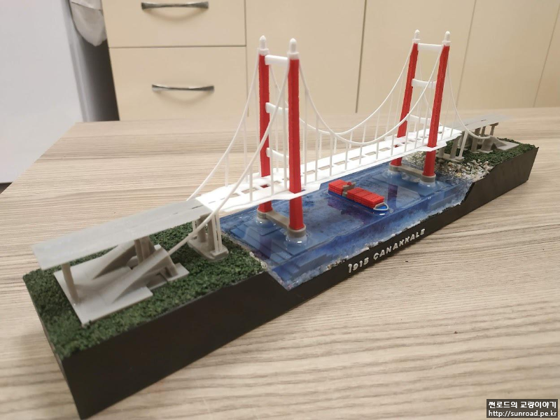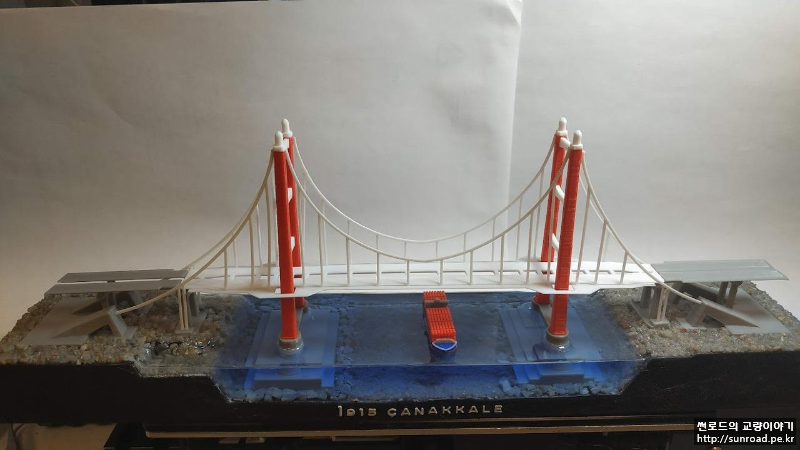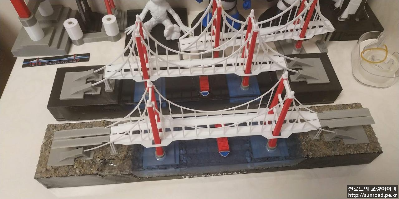 앵커리지도 있는데 접속교가 없으니 좀 허전하여 접속교를 추가하고 메인케이블의 두께도 조금 줄였습니다. 지형도 기왕이면 실제 지형과 조금 비슷하게 아시아 측의 제방을 새로 만들었고 그 위에 모래를 붙여 보았습니다. 모래는 목공풀과 섞은 후 지형 위에 펴 발라 붙였습니다. 주탑 기초 주변에는 나름 세굴방지공을 표현한다고 일일이 알이 굵은 모래를 찾아 하나씩 붙였었으나 들어가는 노력에 비해 별도 티도 안나더군요...