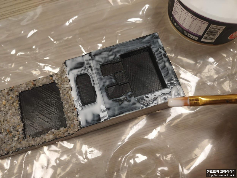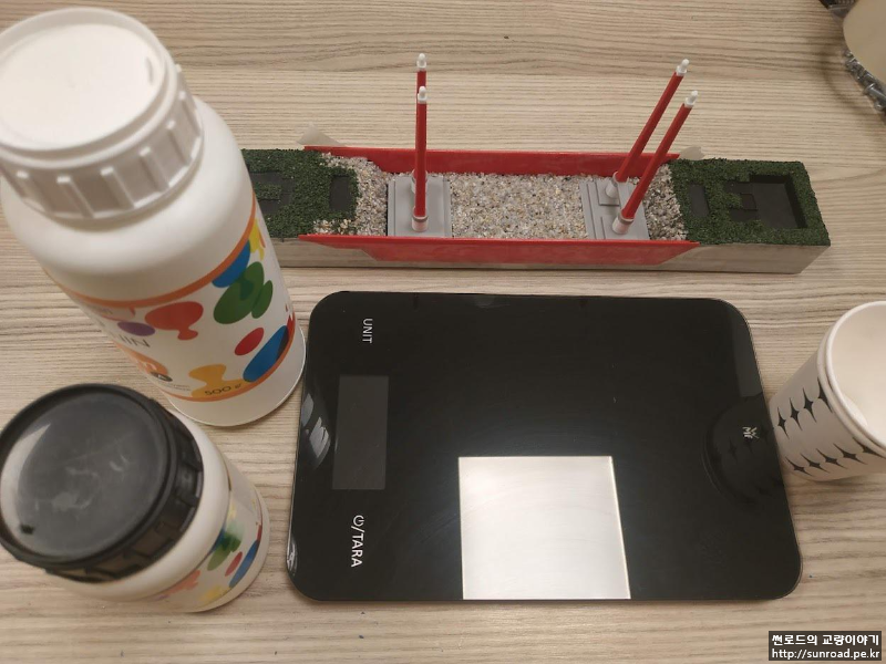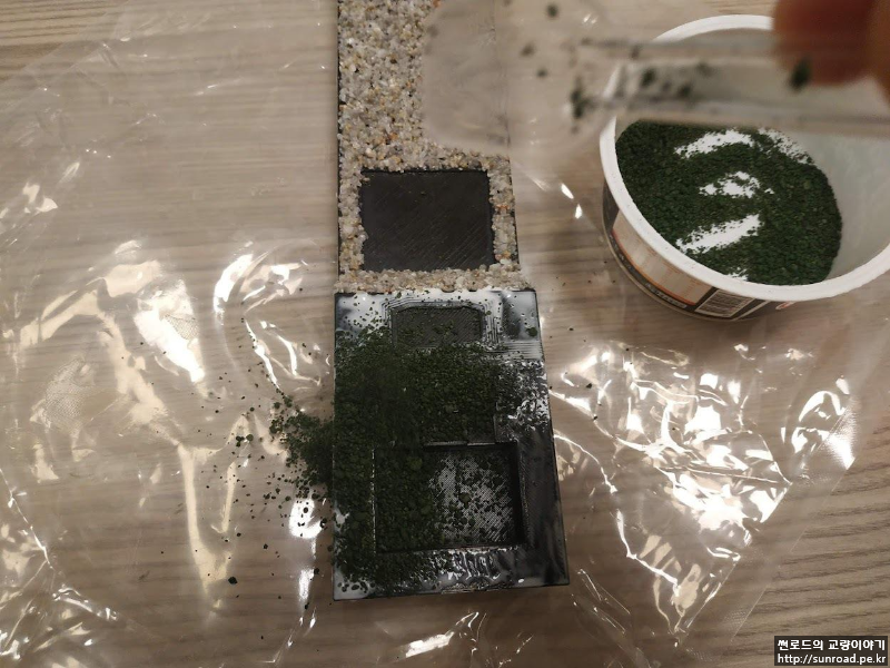 지형을 표현하기 위하여, 바다와 육지에 Flake를 목공풀을 이용하여 붙여주었습니다. 모래는 Batch Plant에서 잔골재를 가져와 채로 쳐서 얇은 모래들만 사용하였고 육지용 Flake는 커피를 내리고 남은 찌꺼기를 말린 후 물감을 섞어 만들었습니다.