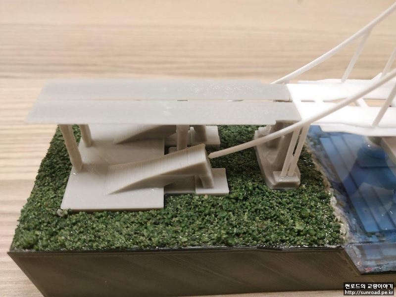 아래 Draft 모형은 두 번째로 만든 것으로 주탑은 높이 방향만 축적을 더 줄이고 Deck는 교축방향 축적을 조정하고 이에 따라 케이블과 데크의 디테일을 변경하였습니다. 부탑은 원래 Scale로 출력하였습니다.