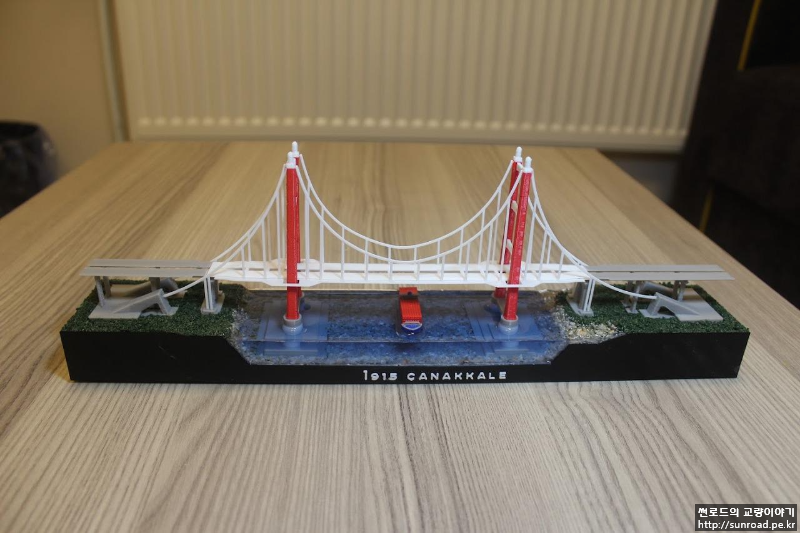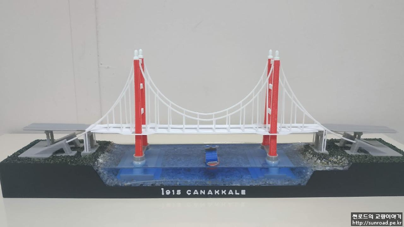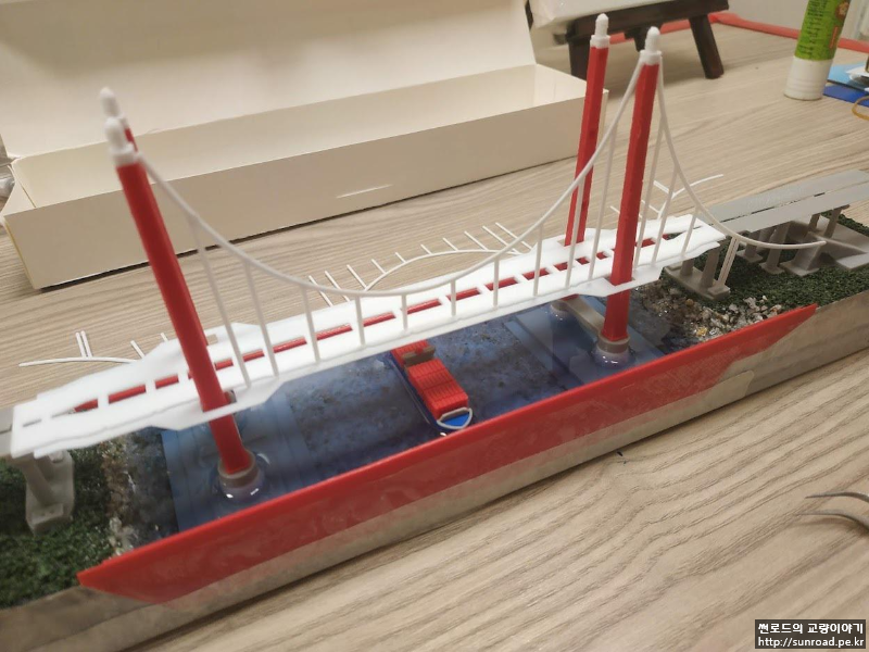 앵커리지도 있는데 접속교가 없으니 좀 허전하여 접속교를 추가하고 메인케이블의 두께도 조금 줄였습니다. 지형도 기왕이면 실제 지형과 조금 비슷하게 아시아 측의 제방을 새로 만들었고 그 위에 모래를 붙여 보았습니다. 모래는 목공풀과 섞은 후 지형 위에 펴 발라 붙였습니다. 주탑 기초 주변에는 나름 세굴방지공을 표현한다고 일일이 알이 굵은 모래를 찾아 하나씩 붙였었으나 들어가는 노력에 비해 별도 티도 안나더군요...