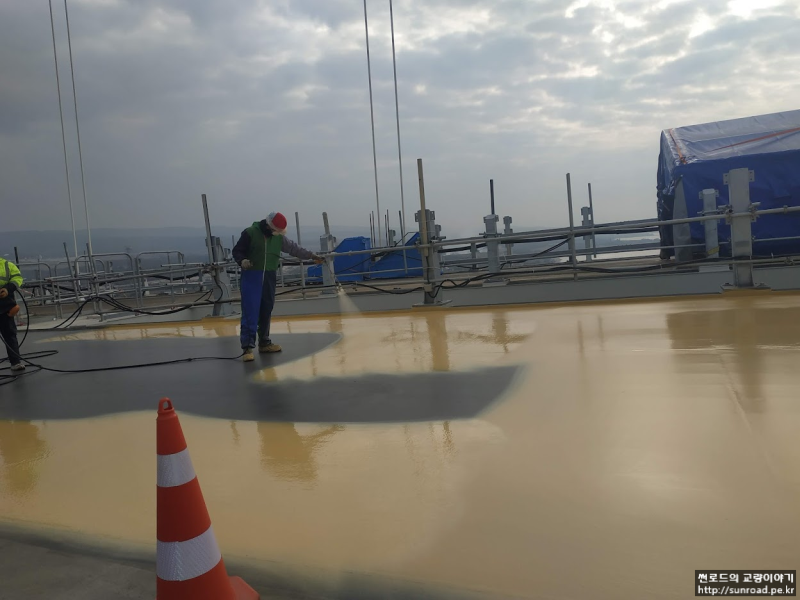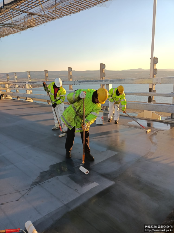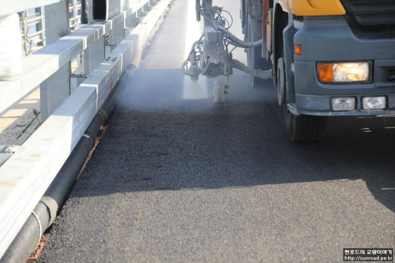 포장은 데크의 가설 및 용접이 어느정도 완료된 후(키세그먼트 시공전) 시작하여 블라스팅, 프라이머, 방수층 등을 시공하였으나 당시 포장 뿐아니라 거의 모든 부대공 시공, 가설구조물 철거 등 많은 공종 들을 동시에 수행하다 보니 작업차량, 크레인 등에 의해 방수층, 택코트 등에 손상이 많이 발생하여 보수하는데 어려움이 있었습니다.