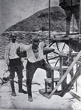 또한 주탑 상단의 Tower Top Cover를 포탄 모양으로 만들었습니다. 포탄 모양은 아래 흑백사진의 Seyit Ali Onbaşı가 포격 중에 크레인이 피격되어 포탄을 직접 등에 지고 옮겼다는 유명한 이야기에서 모티브를 얻었습니다. (포탄의 무게가 200kg이었다는데 과연 혼자서 옮기는 게 가능했겠냐, 그냥 전쟁 영웅 만들기라는 이야기도 있습니다.)