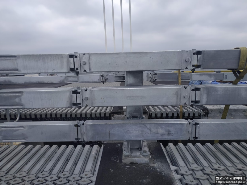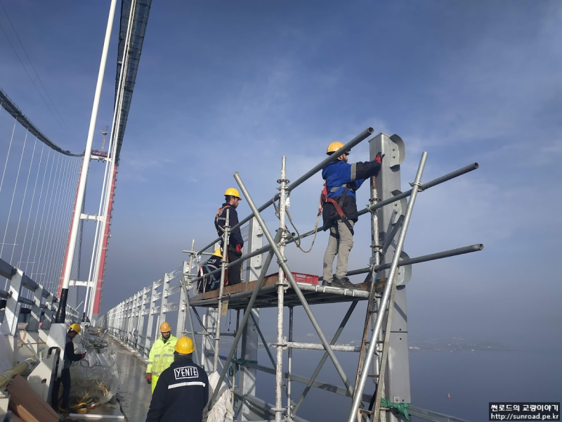 방화벽의 높이는 2.74m로 열을 차단하는 내열 판넬 등으로 구성되어 있습니다. 방화벽은 Expansion Joint 위치에 설치 되므로 2개 파트로 나누어 각각 현수교와 접속교 측에 고정하여 교량의 신축에 대응하도록 계획 되었습니다.
