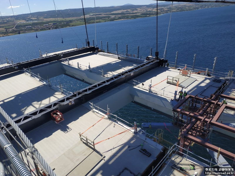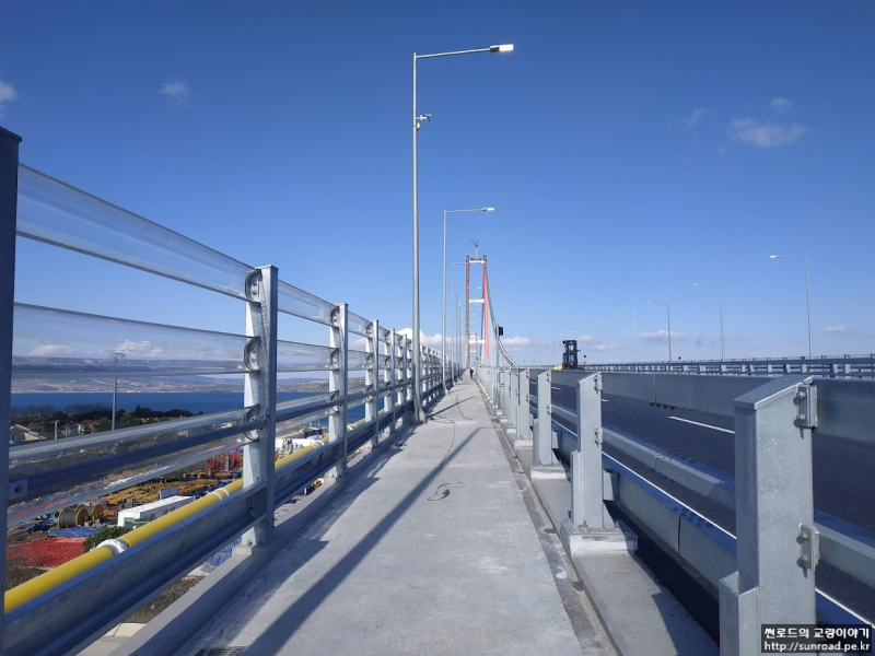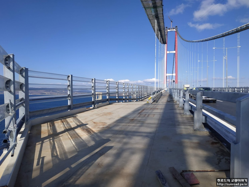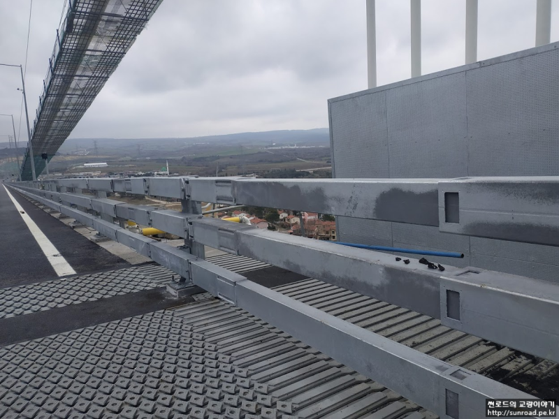 방풍벽(Wind Shield) 교량을 이용하는 차량의 안전을 위해 고려되었으며, 높이는 4m, Porosity 는 50%로 계획되었습니다. 보통 방풍벽을 설치하면 교량데크의 내풍 안정성이 떨어지는 것으로 알고 있었는데, 이는 Single Deck의 경우에 해당되며, 차낙칼레 교량과 같이 Twin Deck의 경우에는 방풍벽 설치시 Flutter 한계 풍속이 증가하는 것으로 나타났습니다.