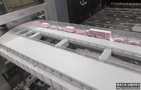 Deck Section WTT(Wind Tunnel Test)시 아래 사진과 같이 주행차량의 안정성을 검증하였고, 방풍벽을 설치시 방풍벽 내부는 약 20%정도 풍속이 감소하는 것으로 나타났습니다. 이러한 WTT 결과를 바탕으로 차낙칼레 교량은 풍속별로 차량의 속도 및 통과차량의 종류를 제한하는 것으로 계획되었습니다. 교대위치(z=38.8m)에서의 풍속이 15m/s부터 차량속도를 65km/s로 제한하는 것을 시작으로 29m/s 부터는 버스, 트럭 등의 통행이, 35m/s 부터는 승용차를 포함한 모든 차량의 통행이 제한됩니다.