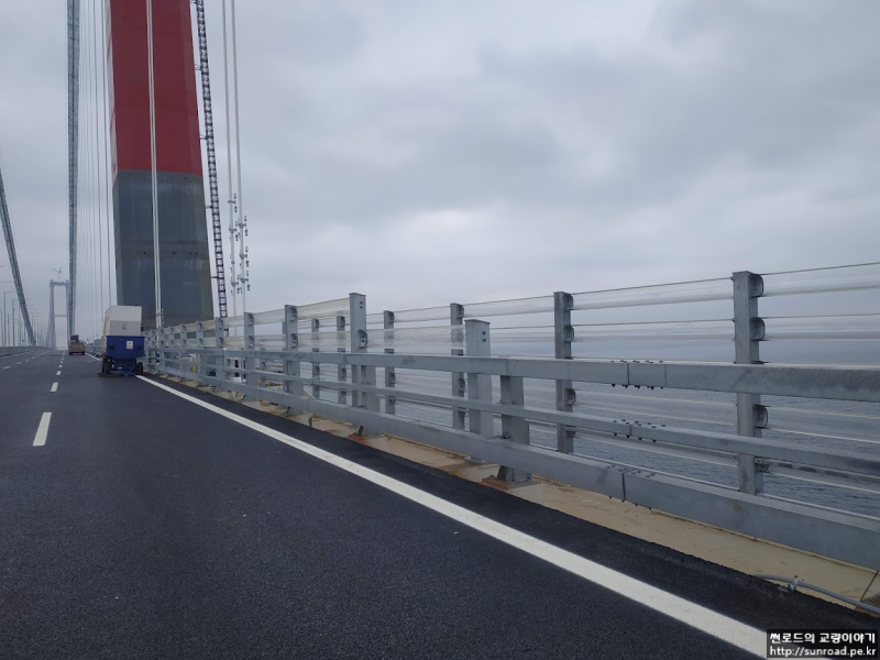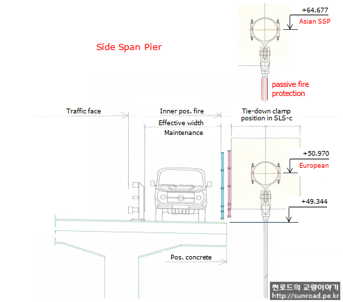 부탑위치에서의 Main Cable이 Deck과 비슷한 높이에 위치하여 교통사고에 의한 화재 발생시 Main Cable 및 Tie Down이 화재에 의해 손상이 발생할 수 있으므로 별도의 방화벽을 설치하였습니다.