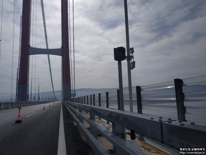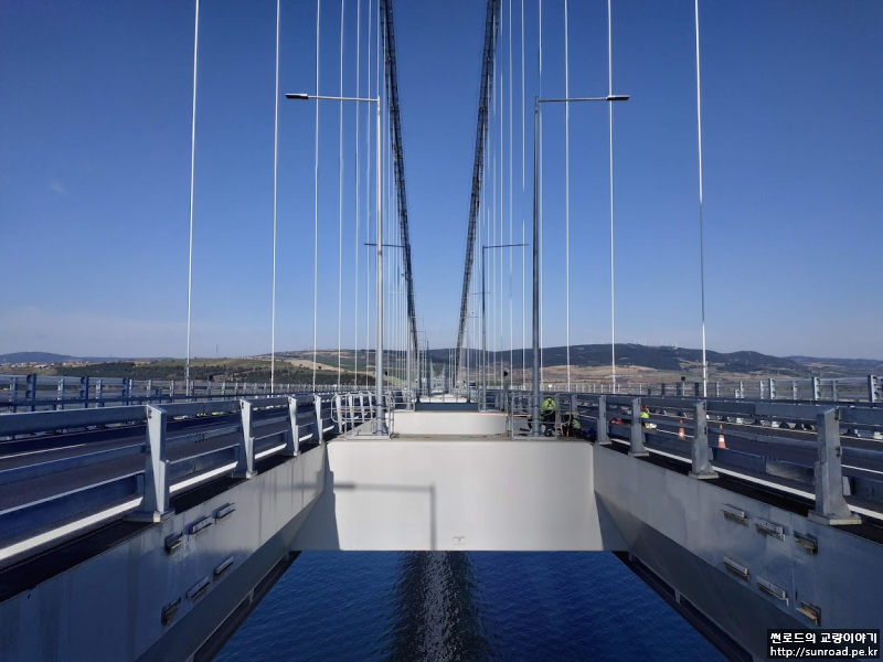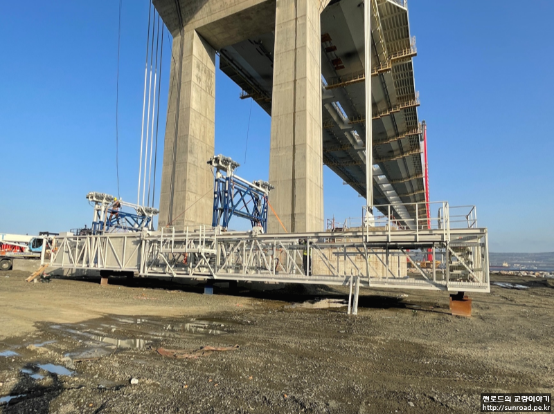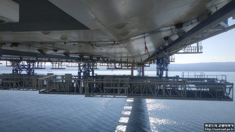 데크 점검차는 현재 설치가 완료되었으며, 유럽측 부탑위치에서 아시아/유럽측 4기 모두 설치하였습니다. 별도로 제작한 지지대위에 점검차를 올린 후 지지대를 크레인으로 인양하고 점검차에 미리 설치한 레일을 공중에서 체결하여 설치하였습니다.