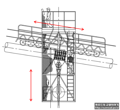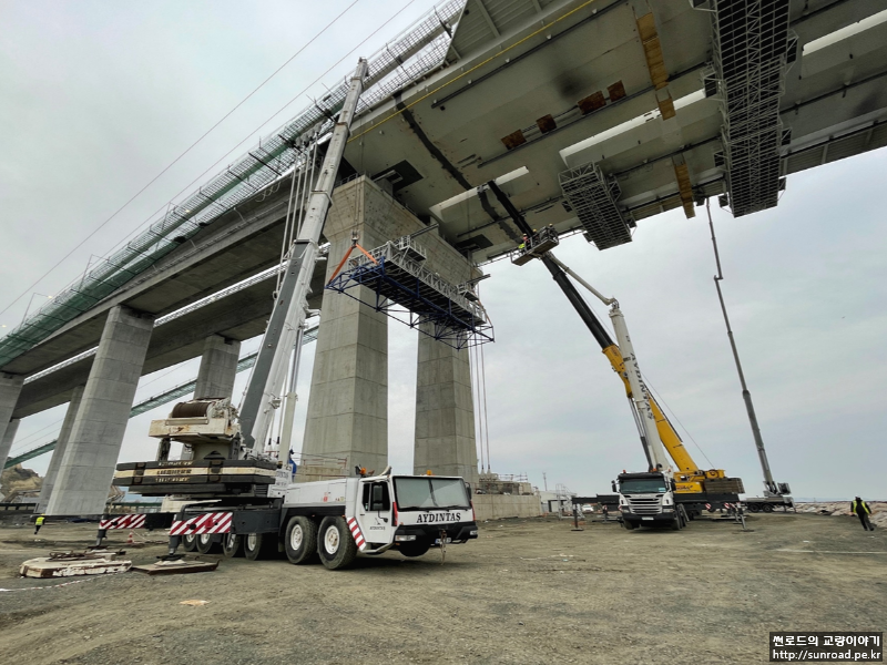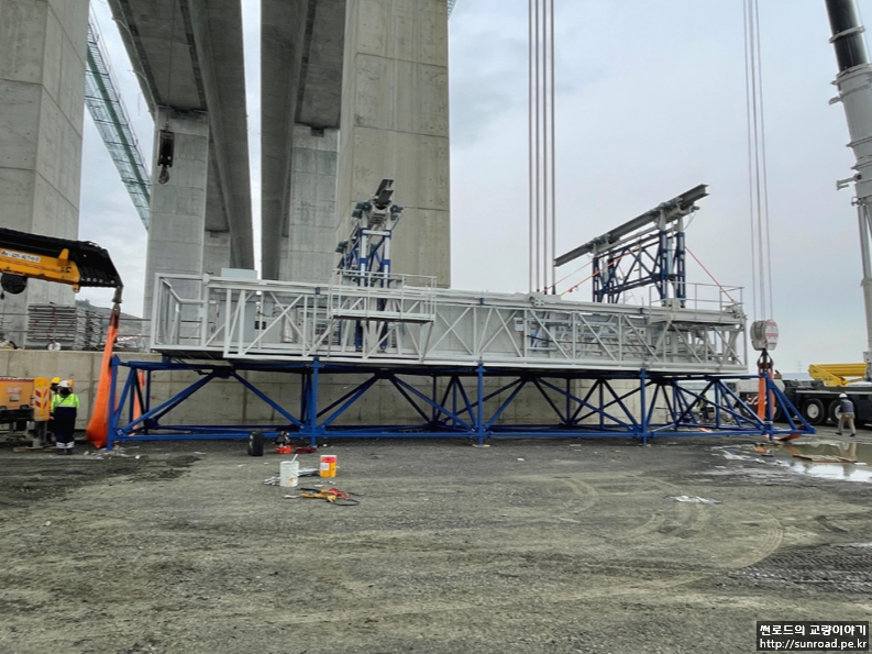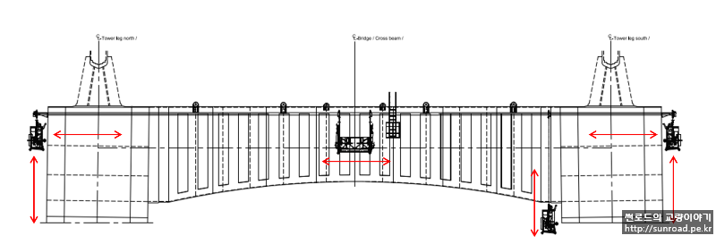 주탑 외부점검을 위하여 곤돌라 형식의 점검차가 계획되었습니다. 3개의 가로보 및 Deck 하단부 위치에 점검차를 위한 레일이 설치되며 레일을 따라 이동하며 주탑 외부를 점검할 계획입니다. 현재 점검차 레일 및 브라켓 설치가 진행중입니다. 주탑 외부 점검차는 상시 설치가 아닌 필요시 설치하여 운용할 계획입니다.