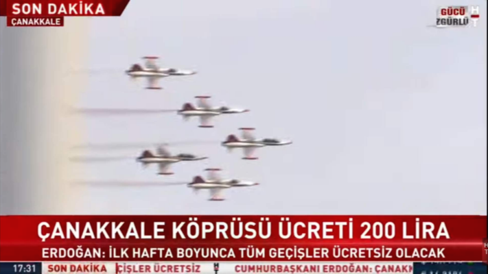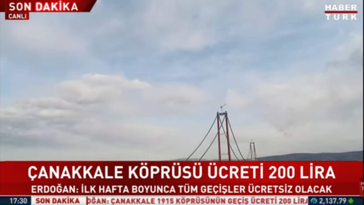 다른 방송에서는 헤드라인이 "차낙칼레 교량 요금 200리라"라고 속보(Son Dakika)로나오네요... 그 밑에는 깨알같이 개통 후 첫 1주일간 무료라고 쓰여있네요....ㅋㅋㅋㅋㅋ