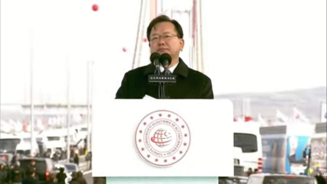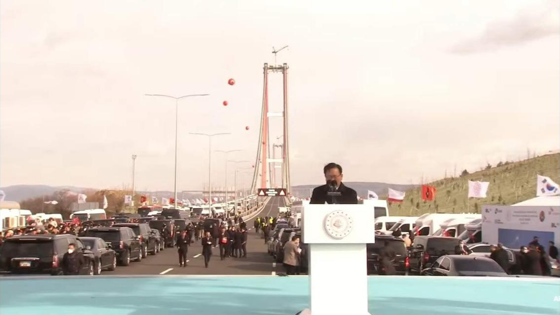 "개통을 축하하며 한국, 터키 두 나라가 아시아와 유럽에 하나씩 있는 주탑과 같이 단단히 버티고 서서 동서양을 잇는 가교 역할을 하자, 그리고 이 교량에 쓰인 케이블의 많은 가닥수 만큼 많은 분야에서 서로 단단히 연결되기를 희망한다" 머 이런 이야기였습니다.