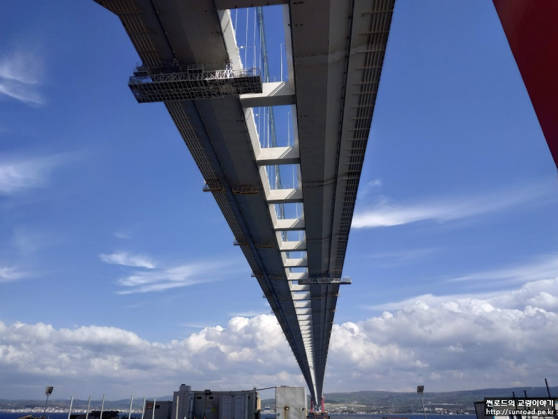 고개를 들어 데크를 바라보니 유럽 부탑에서 설치된 Deck 점검차가 Deck Welding Platform을 하나씩 제거하며 이동하여 유럽주탑에 도착해 있습니다.